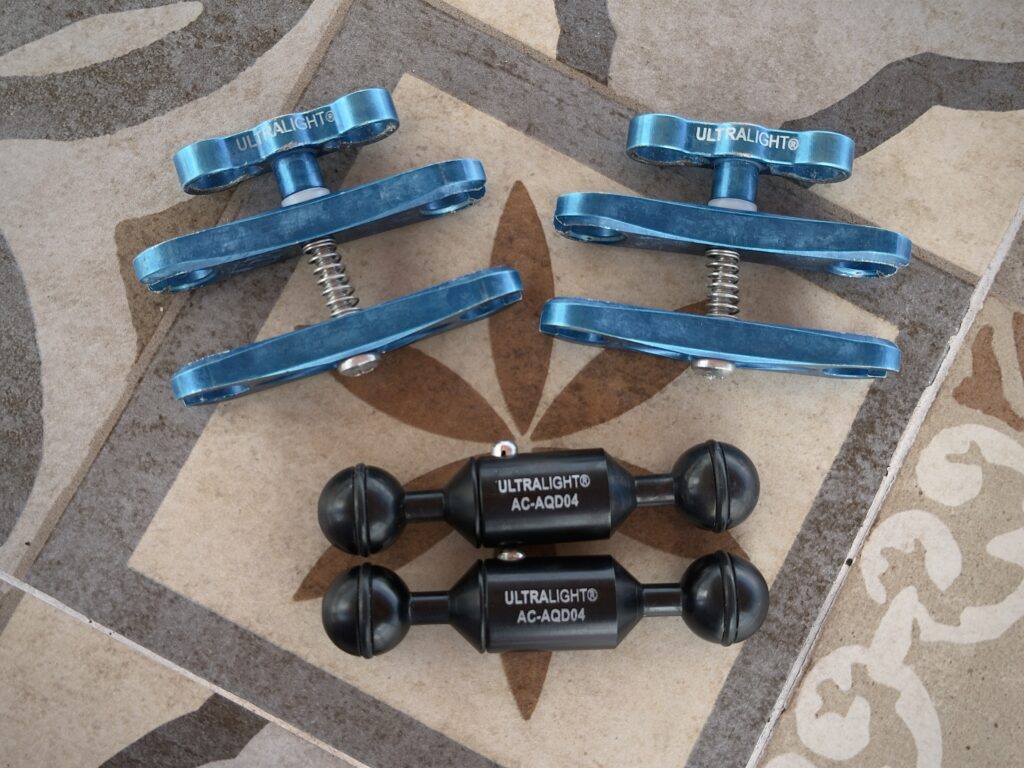 Since I shoot multiple configurations with my rig, I use various combinations of Ultralight aluminum arm segments combined with Nauticam carbon fiber float arms to get my light placement and overall trim and buoyancy dialed in. I use Ultralight double cutout clamps (2 x AC-CSLSK2 and 4x AC-CSSK2) to connect my arms and strobes ensuring I have maximum flexibility in placement for those tricky lighting situations.