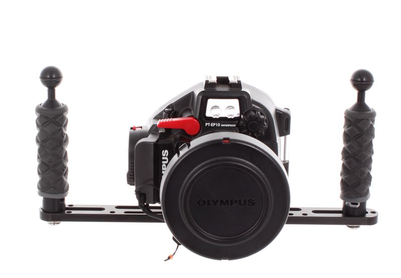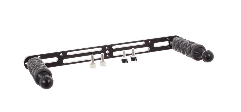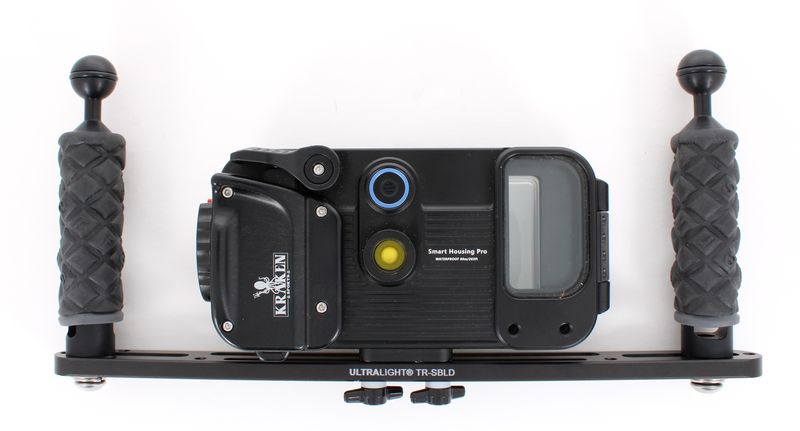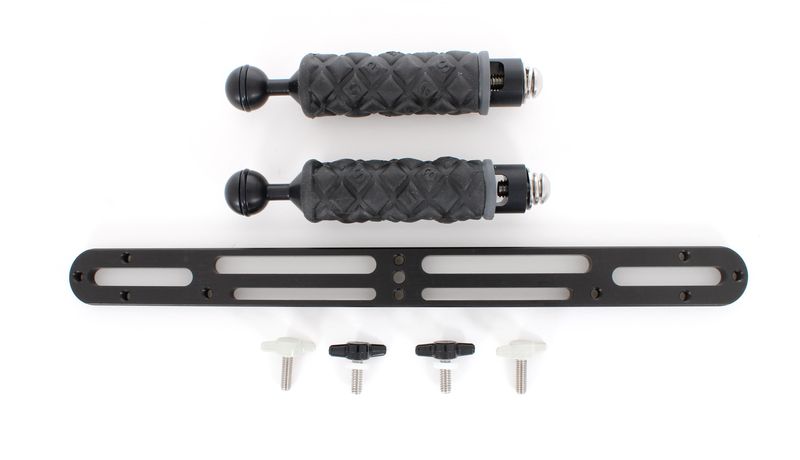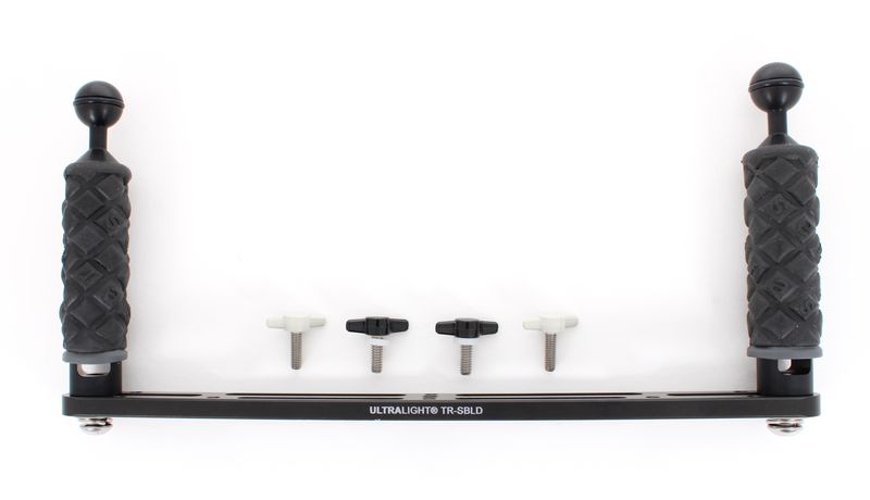 The Ultralight CTKL-02 is a dual handle tray kit designed for large underwater camera housings and smartphones. Built for stability and comfort, it provides a secure platform with multiple mounting points for lights, strobes, and other accessories and is ideal for serious underwater photo and video work. Works good with any large underwater camera housings like Olympus, Ikelite, Fantasea, Nauticam, Sea & Sea, Miralux or similar. This kit will also work with many of the smartphone housings like Divevolk, Sealife, Kracken, Oceanic or similar. Use with cameras that have two to three 1/4" threaded holes on bottom of housing. The molded rubber grip is soft and durable working well with or without gloves. Dual handles offer more stability for improved video or photography.