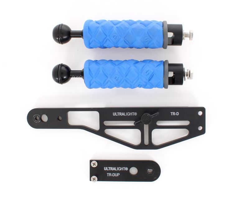 The Ultralight CTKS-03 is a dual handle tray kit designed for compact underwater camera systems. It provides stable two-handed control, improved handling, and multiple mounting options for lights, strobes, and accessories and is ideal for travel-friendly underwater photo and video setups. Works good with any small underwater compact camera like Sealife, Olympus or similar. Use with cameras that have a single 1/4" threaded hole on bottom of housing. Dual handles offer more stability for improved video or photography. The molded rubber grips are soft and durable working well with or without gloves.