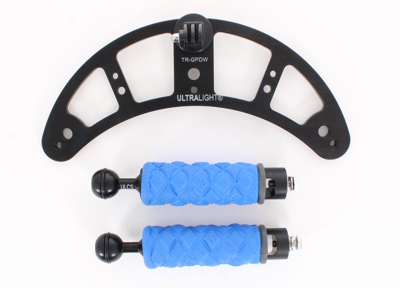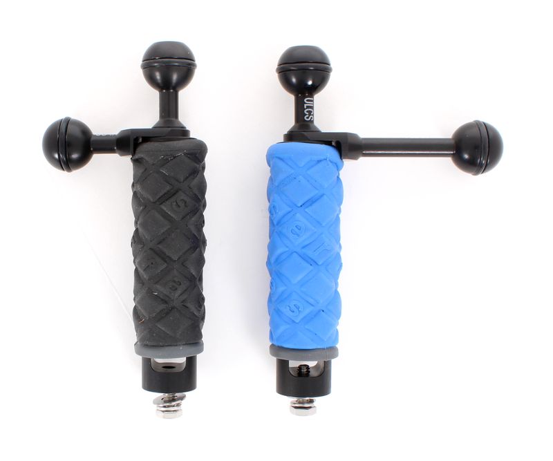 The Ultralight TR-DHB is a blue grip handle with an integrated 1" ball mount, designed for use with Ultralight camera, video, and action camera trays. It offers a secure, comfortable grip and a reliable mounting point for attaching lights, strobes, monitors, and other accessories using standard 1" ball and clamp systems.